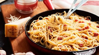 Try typical pasta dishes. Spaghetti alla Carbonara is pasta traditionally mixed with eggs, cheese, bacon, and black pepper, while Bucatini all'Amatriciana has a much stronger tomato base.