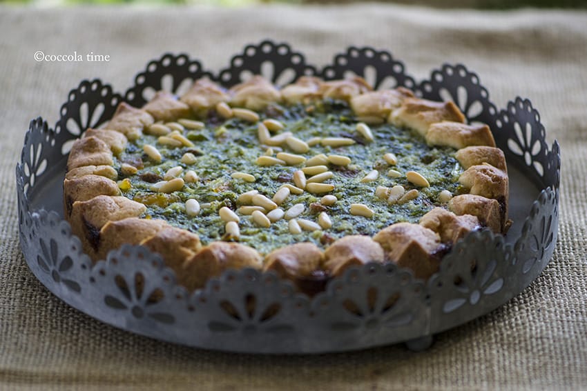 Torta d'erbi or "Torta coi becchi" is a traditional pie made with shortcrust pastry and filled with green vegetables, raisins and pine nuts.