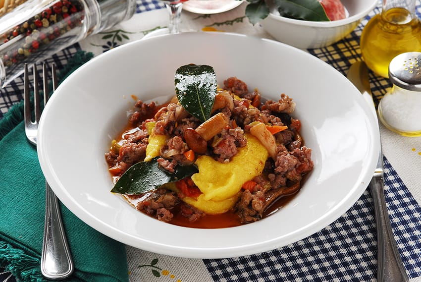 Matuffi starts off with a runny layer of polenta, topped with local sausages and mushrooms.