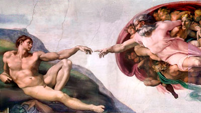 Michelangelo rappresenta sia Dio che Adamo col braccio teso in una posizione simmetrica, proprio per dimostrare che l’uomo è fatto a sua immagine e somiglianza. Adamo, sembra un atleta dell’antichità, è ancora immobile, e il suo corpo è abbandonato sulla terra, per ricordare che è da lì che proviene.