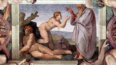 La storia della Caduta dell’Umanità inizia con la Tentazione. Ma Michelangelo non dipinge una mela, come ci aspetteremmo, né un melo, come voleva la tradizione legata al fatto che “Melo” in latino si diceva malum che significava anche “male”. Qui l’albero del peccato è un fico.