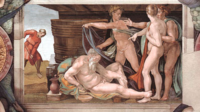 Michelangelo iniziò a dipingere al contrario rispetto all’ordine cronologico, così partì dal fondo della cappella, con le storie di Noè, quelle più recenti, andando a ritroso nel tempo, fino alla Creazione.
